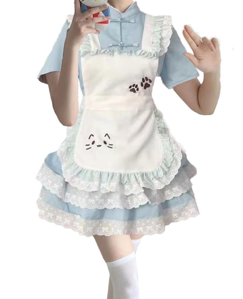 QOOLY Cosplay Maid Dress, Lolita Costume, Short Sleeves, Uniform, Light Blue, Size L