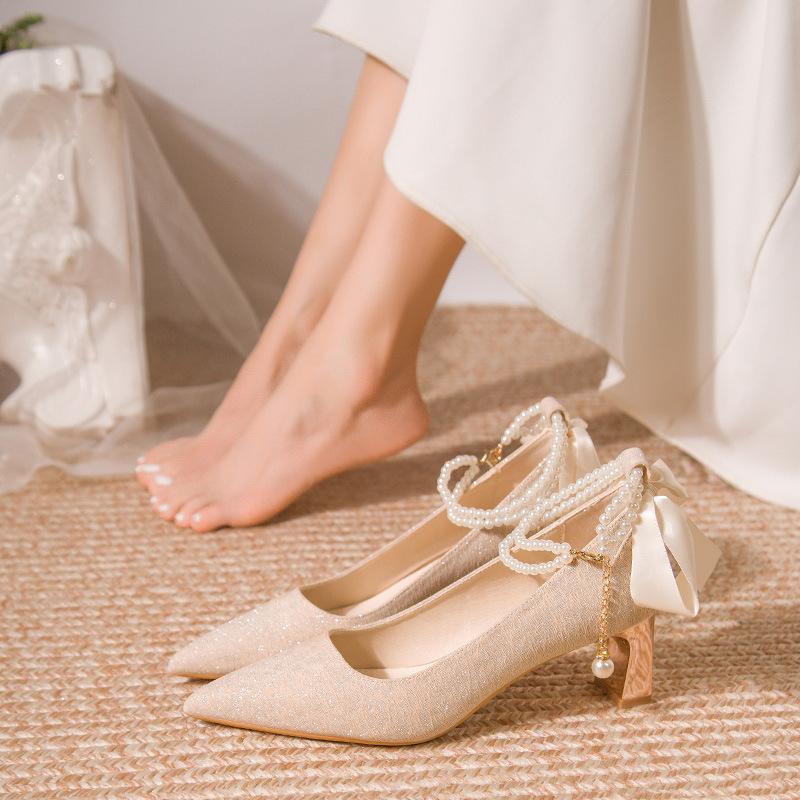 Coarse heel wedding shoes, Hexiu wedding dress two wear bridesmaid shoes, daily wear pointed head shallow mouth bride high heel single shoes women