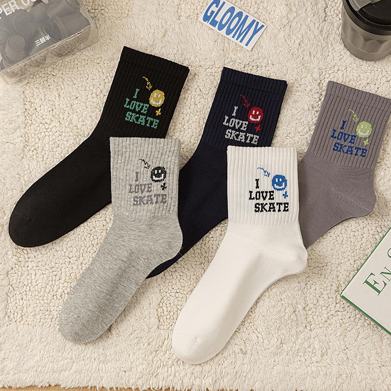 Men's New Trend In Autumn Cartoon Smiling Face Letters Sweat Absorption Breathable Sports Boneless Tube Socks