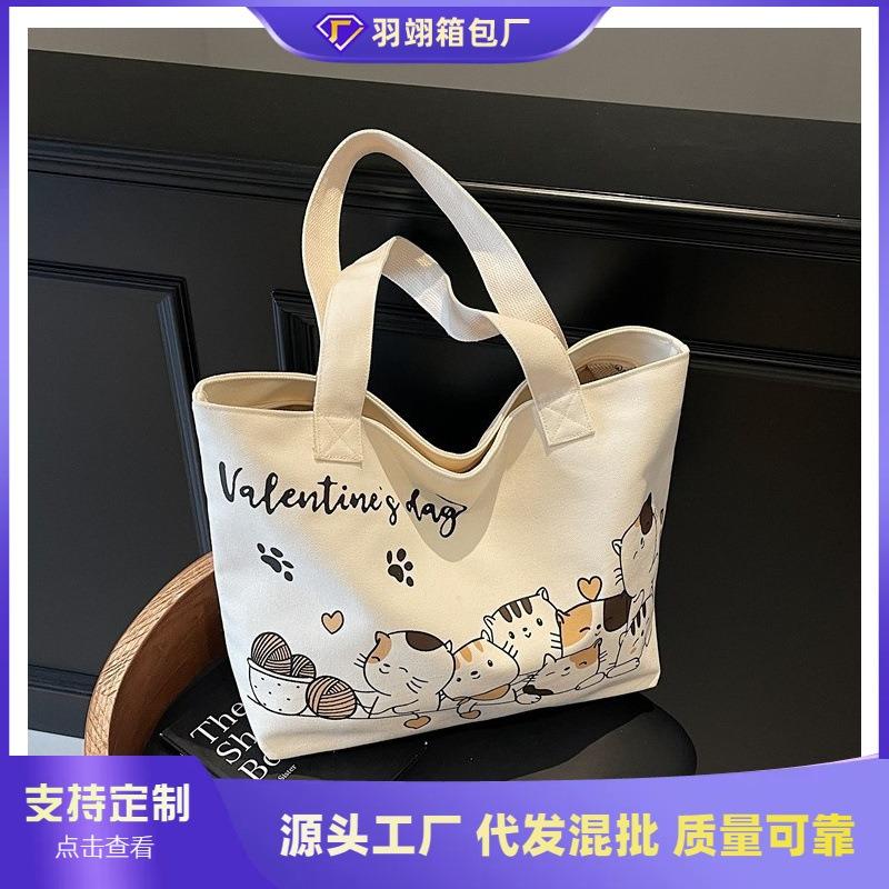Large Capacity Cartoon Canvas Bag Girls' Student Wear Book Commuter Tote Bag Casual Simple Lightweight Shoulder Cloth Bag