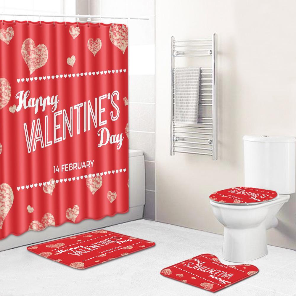 Valentine'S Day Toilet Shower Curtain Four-Piece Printed Floor Mat Set Bathroom Floor Mat Bedroom Absorbent Door Mat Carpet