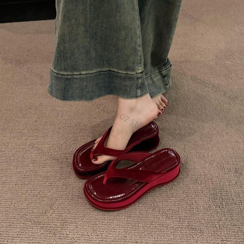 Fashion New Red Casual Style Thick-soled Flip-flops with Flip-flops, Fashionable and Trendy Height-increasing French-style Cool Slippers