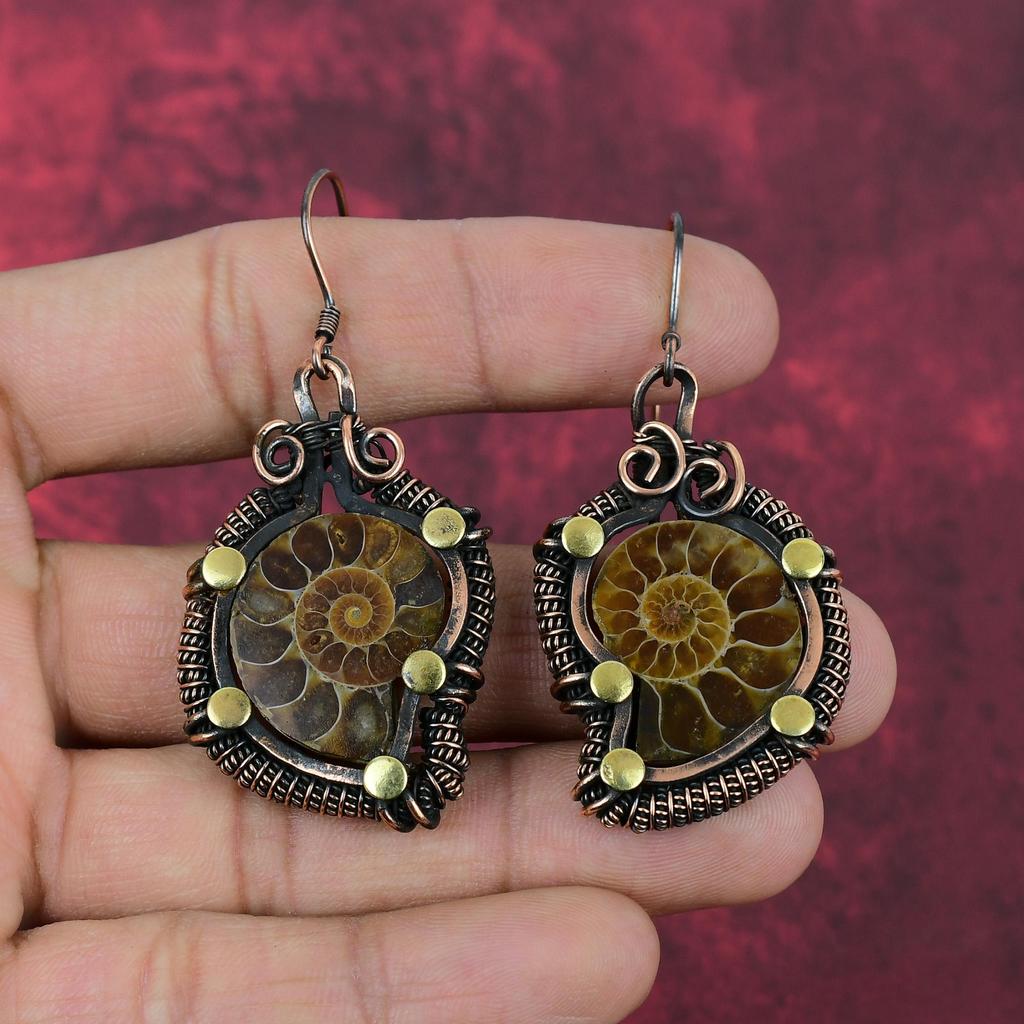 Ammonite Fossil Earring Copper Wire Wrapped Earring Elegant Jewelry Handmade Gemstone Earring Gifts For Wife Stylish Earrings Copper Jewelry