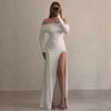 White knitted sexy one-word shoulder dress female autumn royal sister wind pure desire to close the waist split fork inside with a bottom skirt