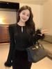 Simple and thin black long-sleeved knitted dress with a base inside, a skirt with a coat in winter