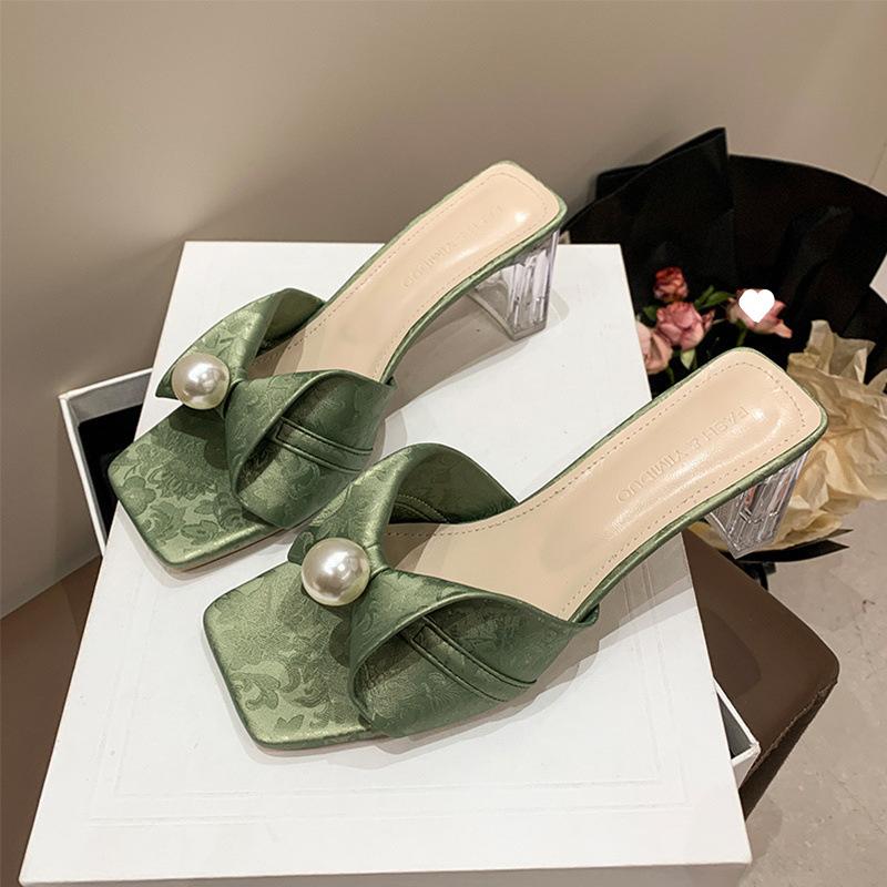 National style pearl slippers women's new summer wear high-end French temperament crystal thick heel
