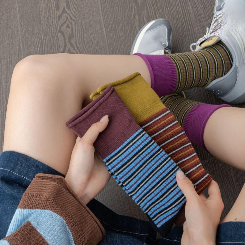 Autumn and Winter Color-blocking Striped High-slit Mid-calf Socks for Women's Fashion Pairs with Pure Cotton Puffy Long Socks