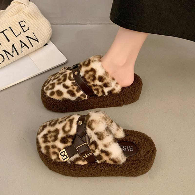 Internet celebrity explosion leopard print fluffy slippers women wear autumn and winter new thick-soled plush bag head half drag cotton shoes