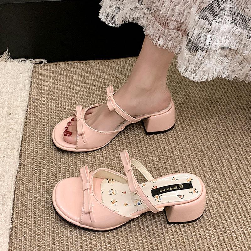 One-word sandals women's models 2025 summer new thick heels with skirts French bows and high-heeled cool slippers