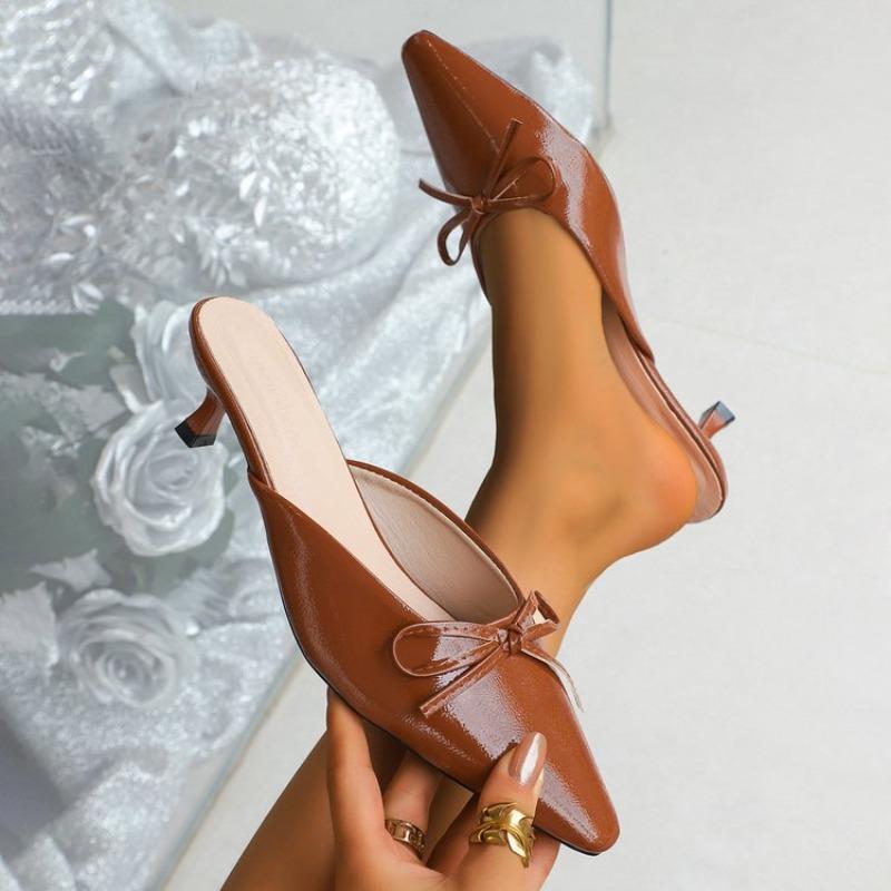 Women Fashion Butterfly-Knot Thin Heels Slipper Shoes Women Pointed Toe Slides Women Elegant Medium Heel Solid Mules Slippers
