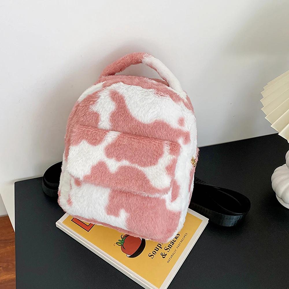 1pc Cow Pattern Plush Backpacks Multifunctional Portable Shoulder Bag Women Adjustable Strap Shopping Bags for Birthday Gifts