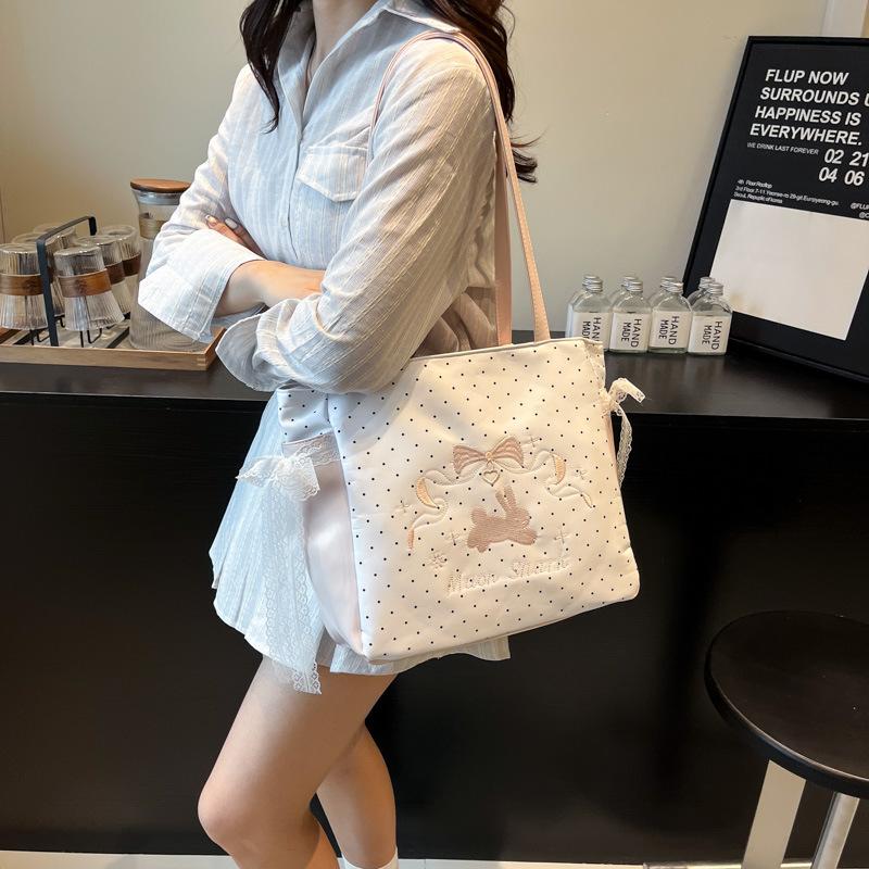 Lazy relaxation bag women's 2025 new fairy lace canvas bag large capacity polka dot versatile tote bag