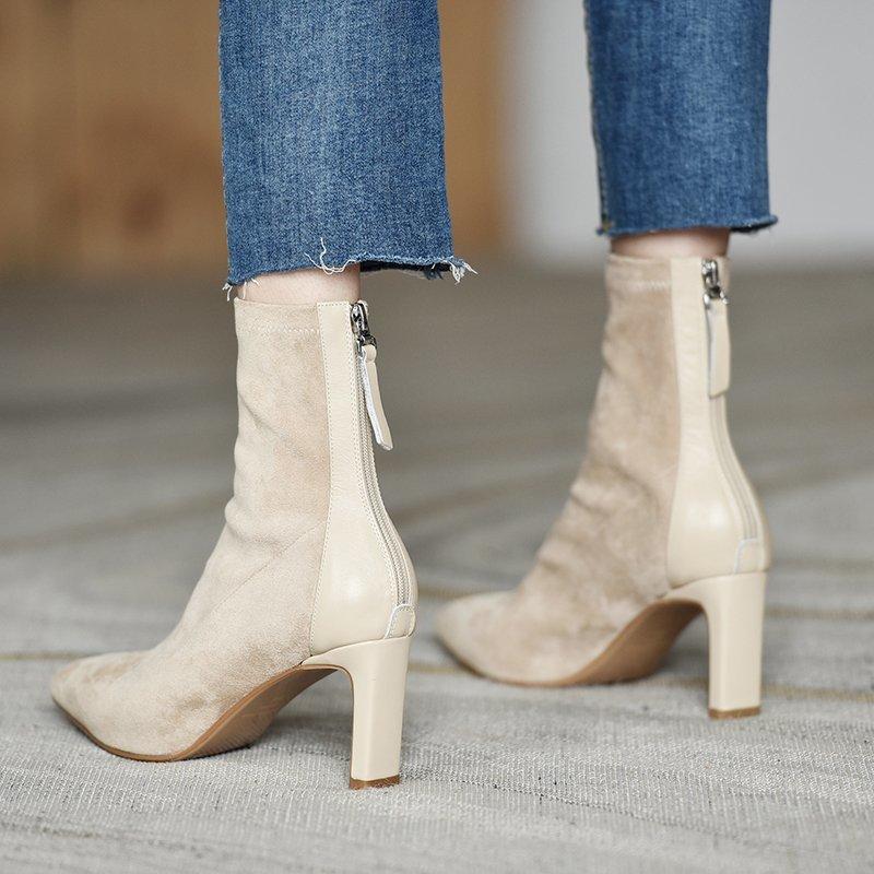 French pointed high-heeled short boots women's 2025 autumn and winter new suede thin boots thick heel elastic boots black small bare boots