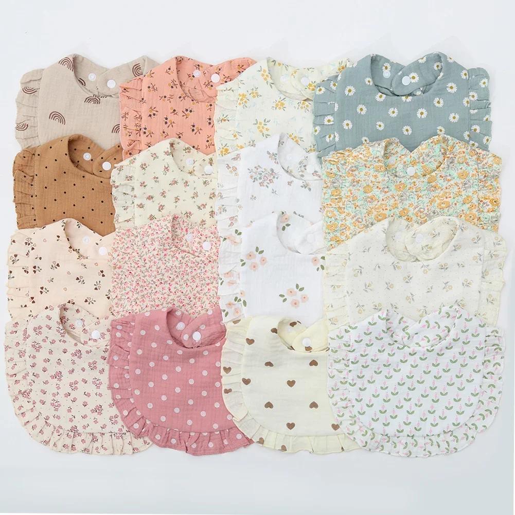 Flower Print Baby Bibs Adjustable Snap Saliva Towel Ruffled Edge Muslin Cotton Burp Cloths Rainbow A Grade Girls Feeding Scarf