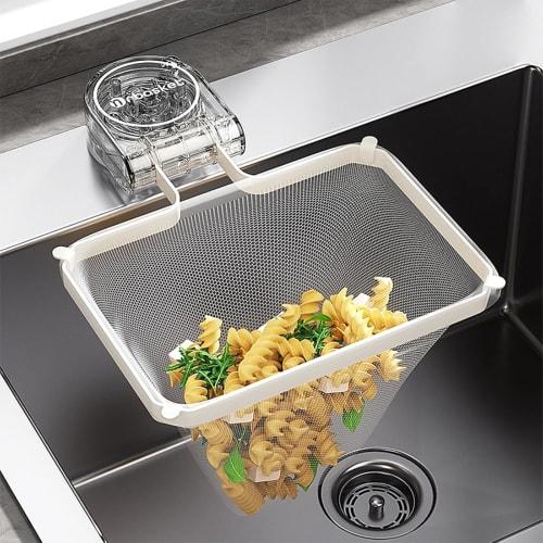 Foldable triangular drainer net with strong suction cups for drains, food waste disposal, and a clean, triangular drainer. No need for a drainer. Incl