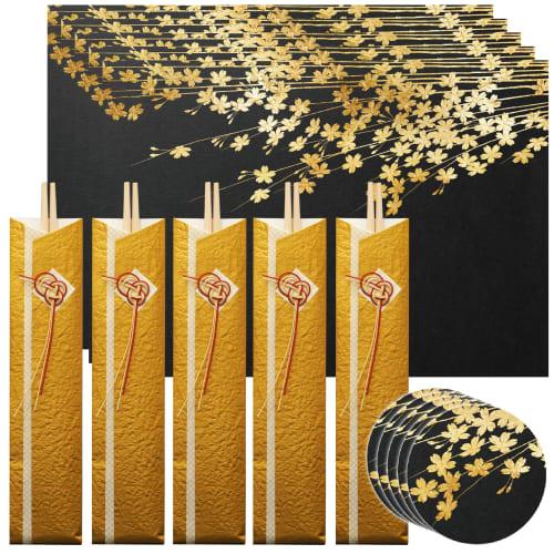 RingLeaf Ready-to-Use Chopsticks, Premium Washi Placemats, and Floral Coasters, Set of 5 Each, Made in Japan | (Gold)