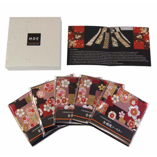 Perfect as a gift! Pre-wrapped, boxed set of 5 gold brocade Japanese-style kimono coasters (Benisakura)