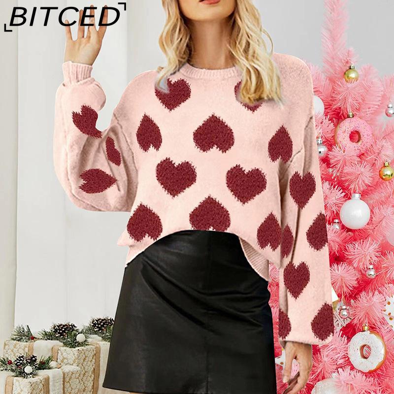 BITCED Bubble Sleeve Valentine's Pink Sweater Loose-Fit Sweet Heart-Patterned Cable-Knit Pullover