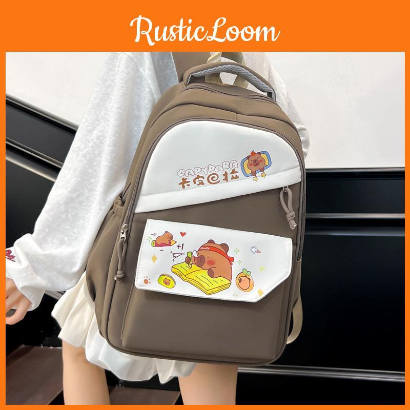 Cartoon Capybara Pattern Nylon Backpack With Striped Stitching For School Travel