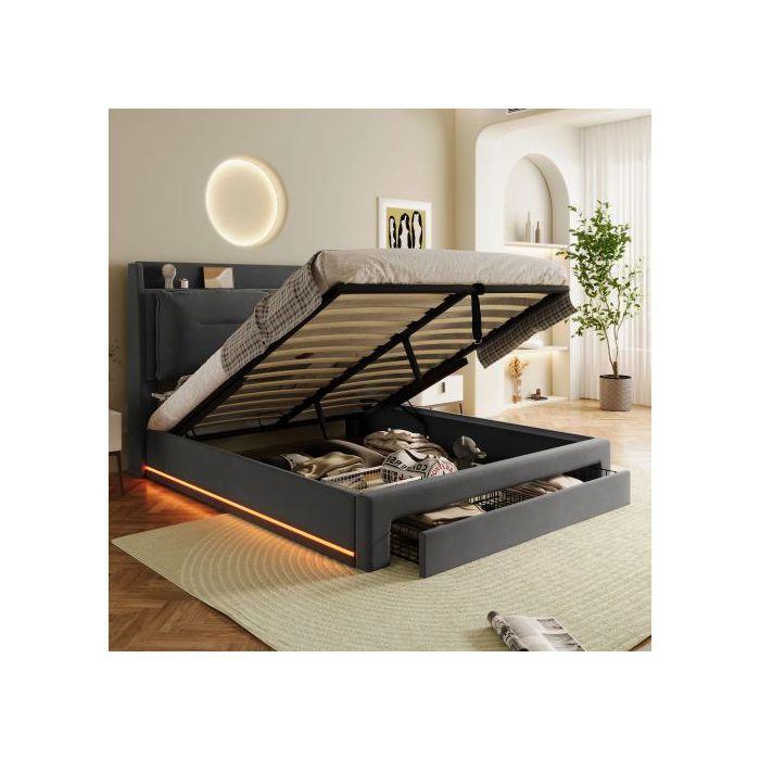 Lit d'éclairage LED - MUVOE - 160x200 - Velours gris foncé - Lit hydraulique - Rangement intégré