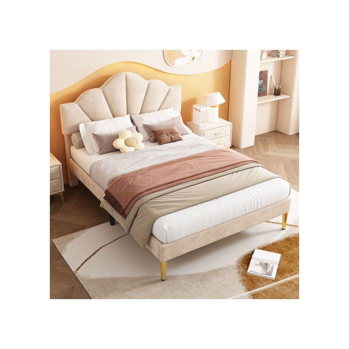 Lit rembourré - MUVOE - 140x200 cm - Velours beige - Tête de lit réglable - Sommier à lattes en bois