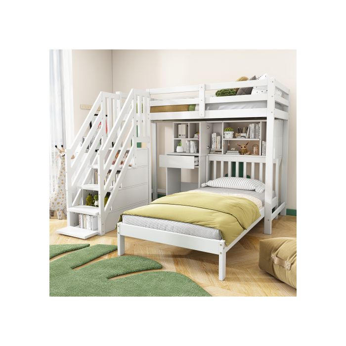 Pat de copil - MUVOE - 90x200 - Alb - Birou și etajeră integrate - 2 locuri