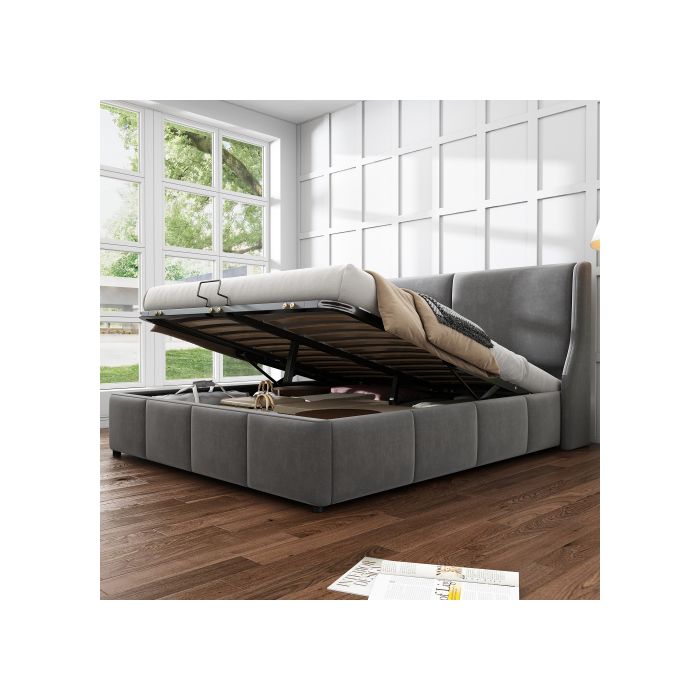 Lit rembourré,forme oreille,tête de lit,lit double,lit fonctionnel hydraulique,140 x 200,gris