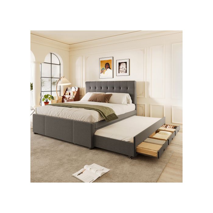 Lit rembourré - MUVOE - 140x200cm - Tête de lit réglable - 3 tiroirs - Gris
