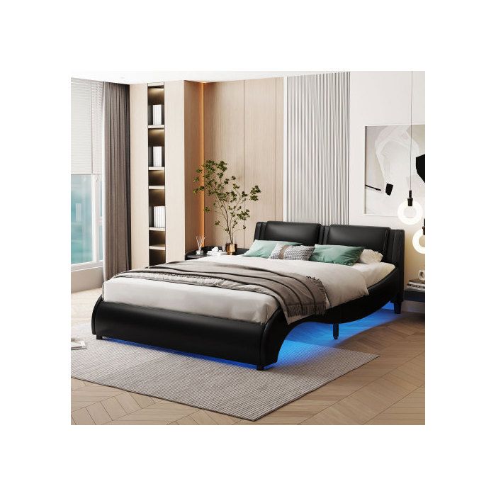 Lit - MUVOE - 140x200cm - Simili cuir noir - Éclairage LED - 2 places