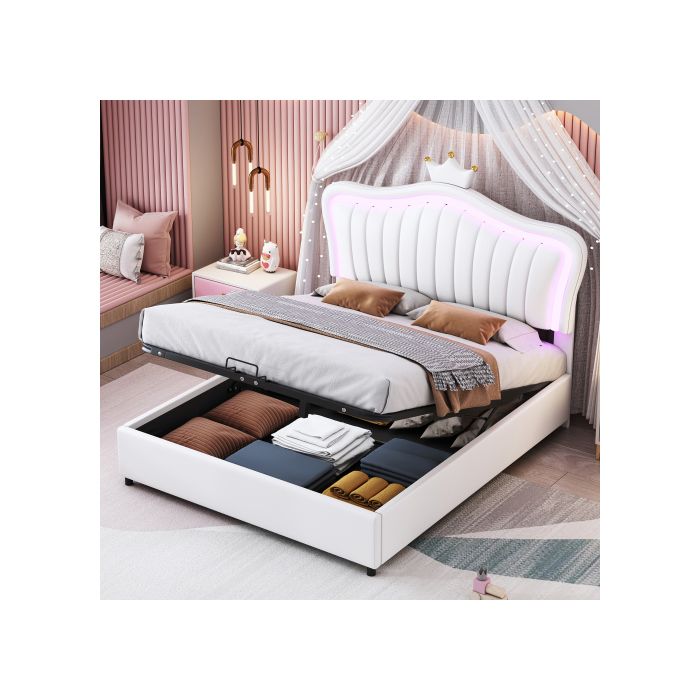 Lit d'enfant - MUVOE - 140 x 200 cm - Similicuir blanc - Rangement hydraulique - LED multicolore