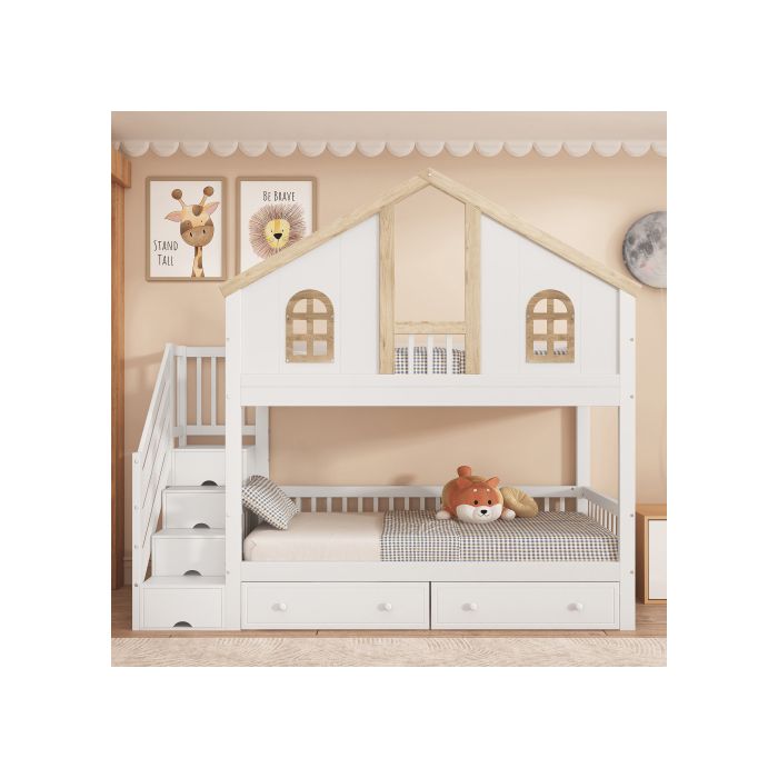 Pat supraetajat - MUVOE - 90x200 cm - Alb și tonuri naturale - 2 sertare - Siguranță EN747