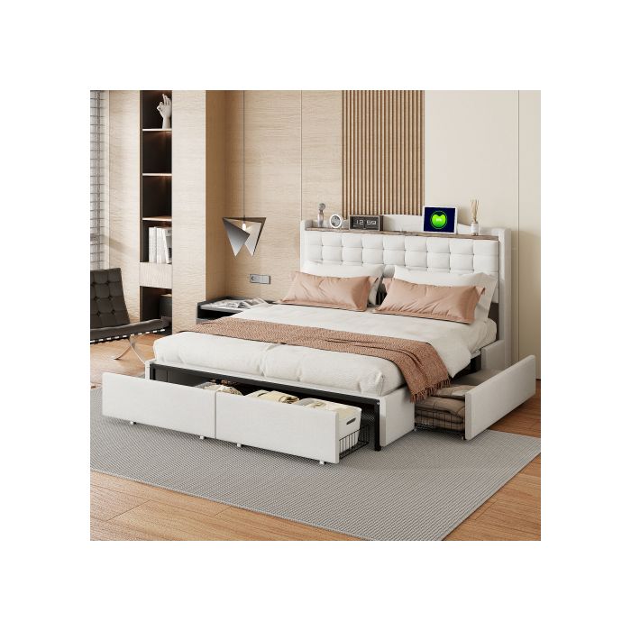 Lit double rembourré - MUVOE - 160x200 cm - Tiroirs de rangement - Prise USB intégrée - Tissu lin Beige