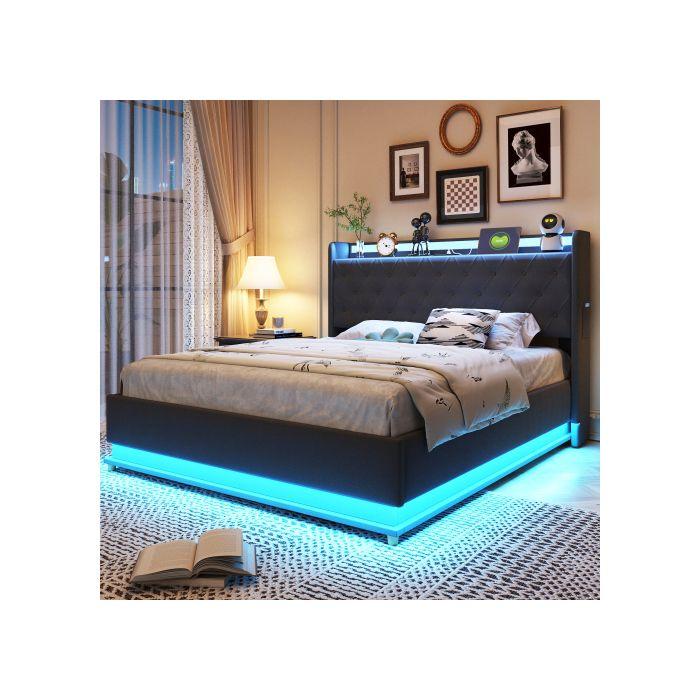 Pat LED - MUVOE - 140x200 cm - Țesătură de in gri - Încărcare USB - Depozitare hidraulică