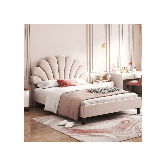 Pat dublu tapițat - MUVOE - 140 x 200 cm - Tăblie florală - MDF robust - Montaj ușor