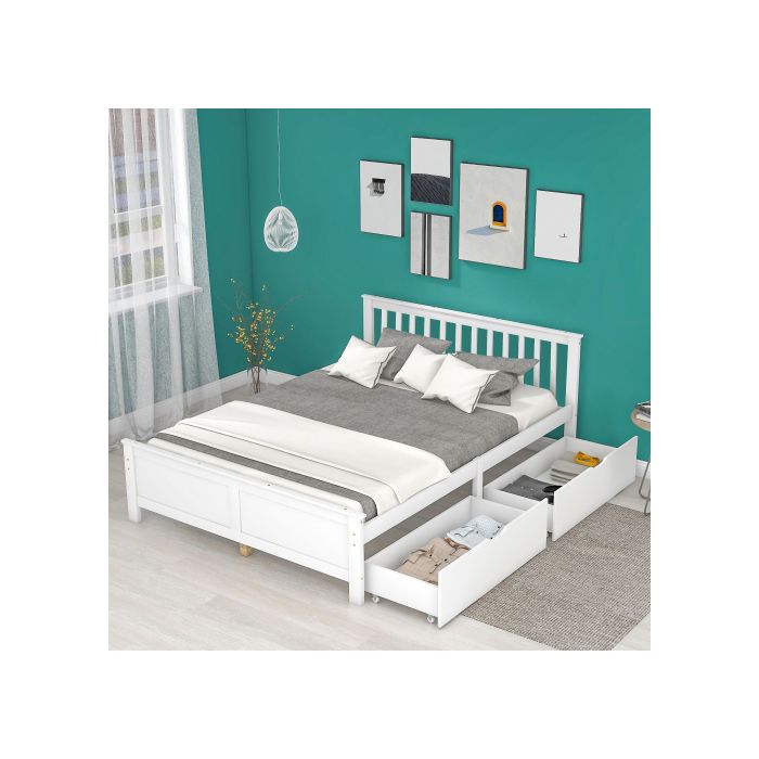 Lit double - MUVOE - 140x200 cm - Bois massif - Blanc - Avec tiroirs de rangement