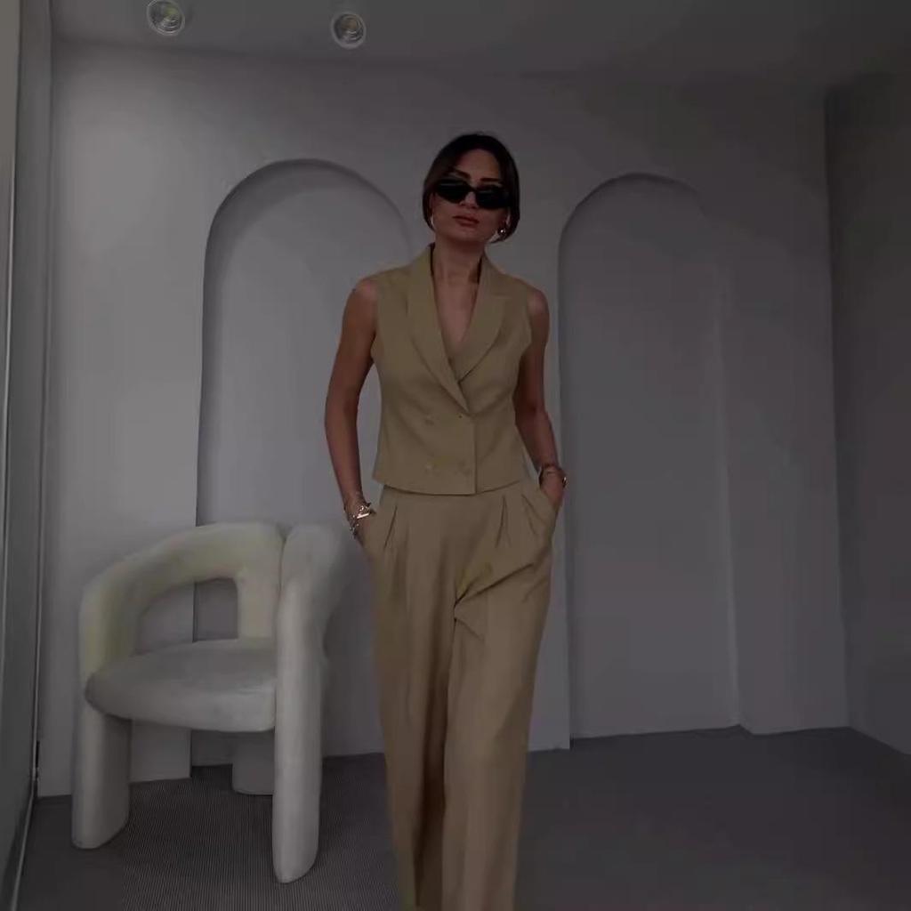 2024 Summer European & American Solid Color Lapel Sleeveless Vest and Wide-Leg Long Pants Set