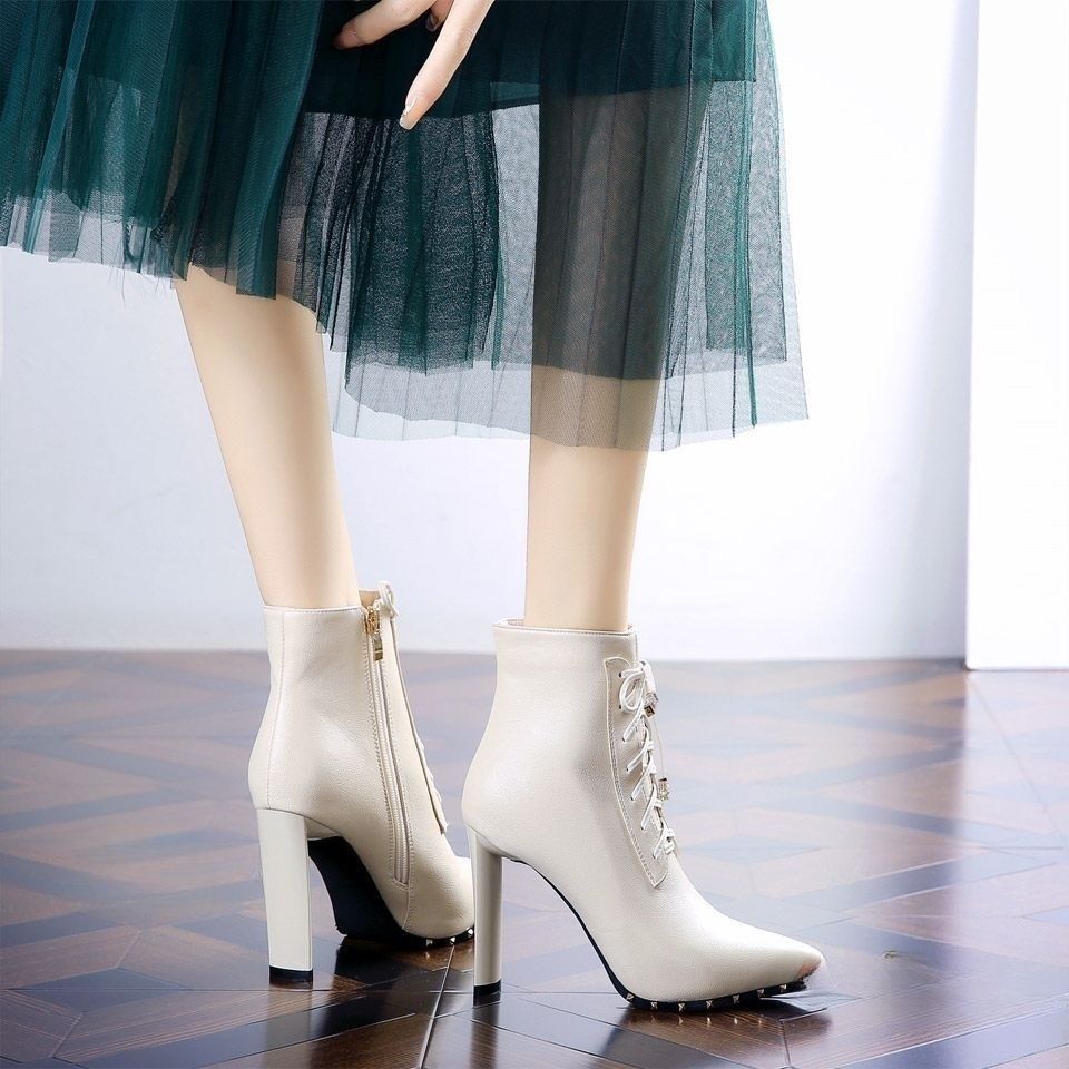Thick heel pointed Martin boots women's 2025 new rivet fashion high heels Internet celebrity short boots thin boots ins tide
