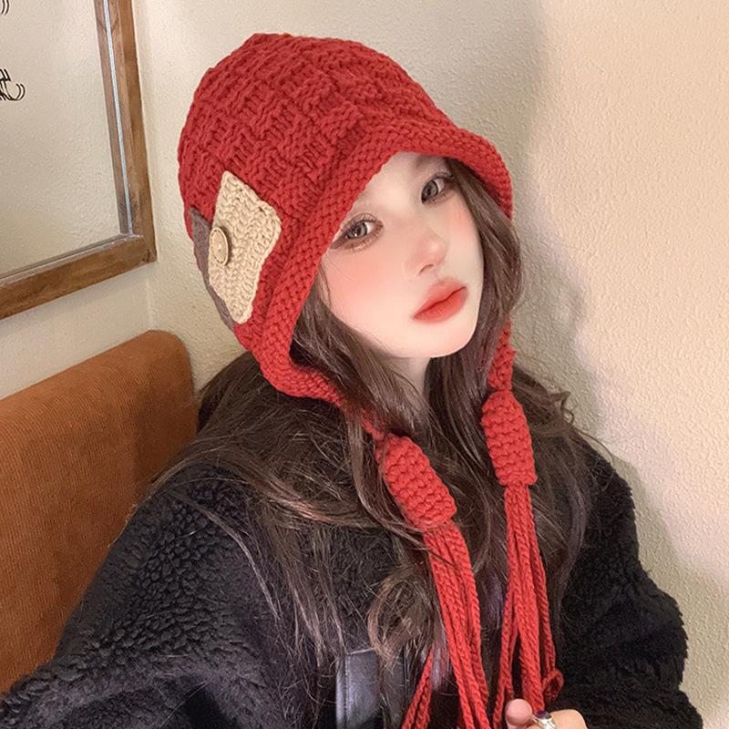 Korean Style Tassel Fashion Knitted Hat for Women in Autumn and Winter Handmade Pullover Lei Feng Hat Warm Ear Protection Retro Woolen Hat