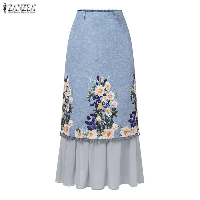 ZANZEA Fuste Florale Patchwork Casual pentru Femei cu Talie Elastică la Spate