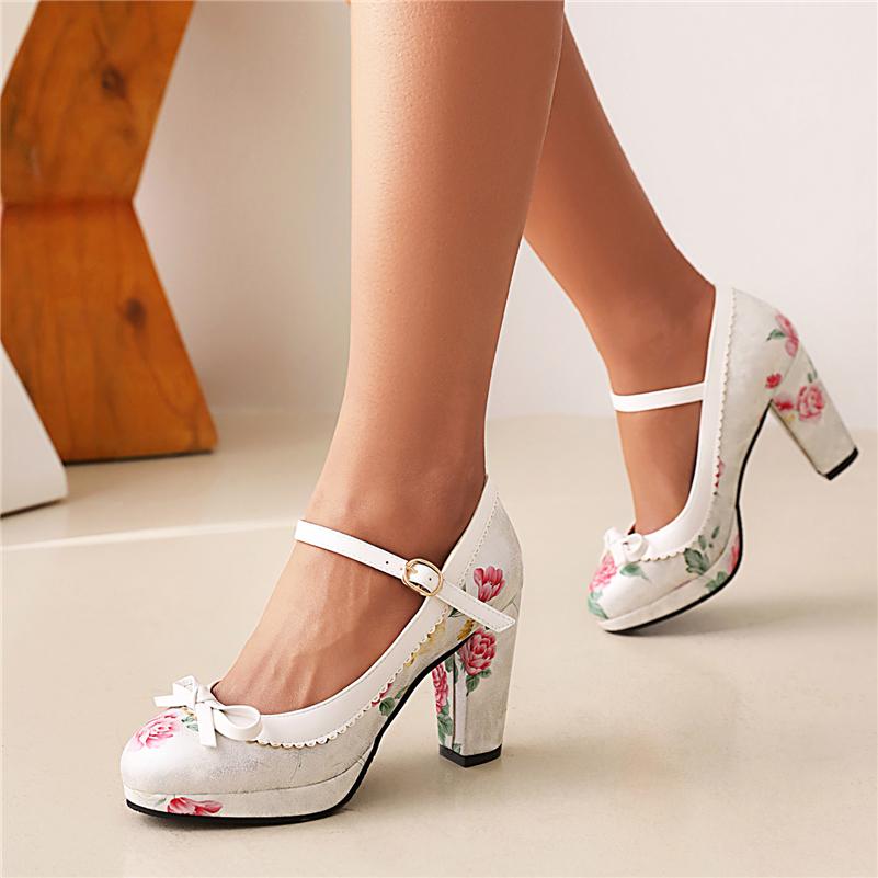 FOREADA Women Mary Janes Pumps Round Toe Thick High Heels Lolita Floral Buckle Bow Glove Shoes Ladies Fashion Shoes Spring Autumn