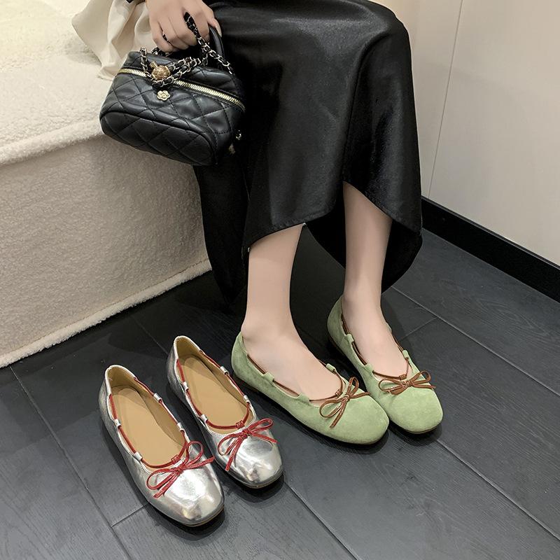 2025 season autumn new French retro round head flat bottom shallow mouth single shoes women's bow decoration casual versatile grandma shoes