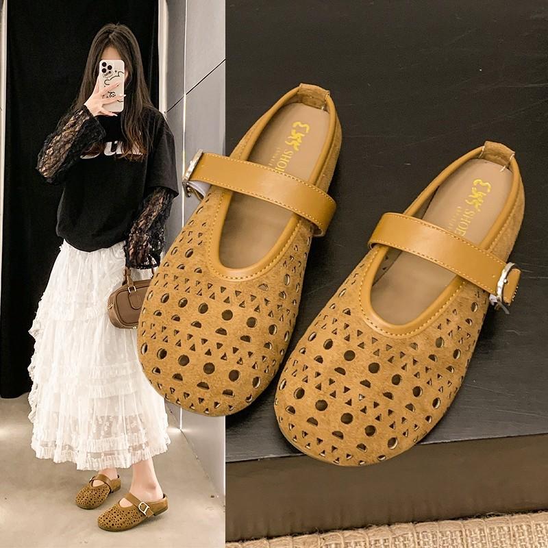 Soft bottom breathable hollow hole shoes fairy style with skirt round head flat bottom one word buckle belt Mary Jane slippers