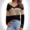 Tricou pulover tricotat casual cu gât în V larg, mâneci lungi și cusături contrastante pentru femei, stil nou
