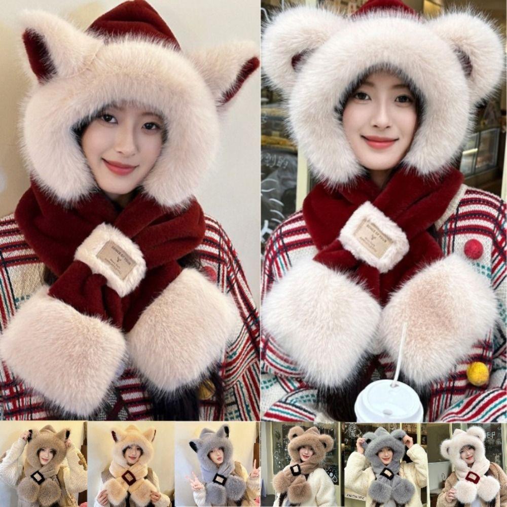 Two-Piece Set Plush Bear Hat Scarf Thickened Neck Warmer Hat Cute Ear Protection Hooded Winter