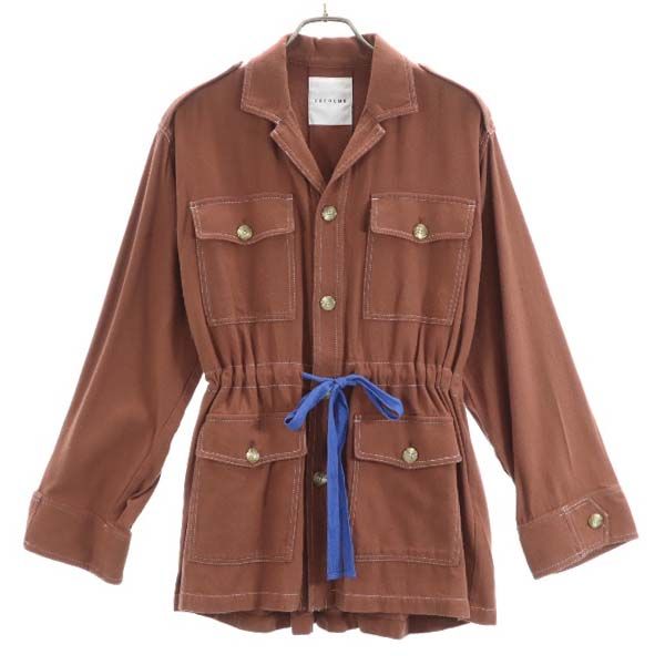 This safari jacket features a rustic material that gives it a casual look. It can be worn open in an oversized style or bloused at the waist for a more defined look.