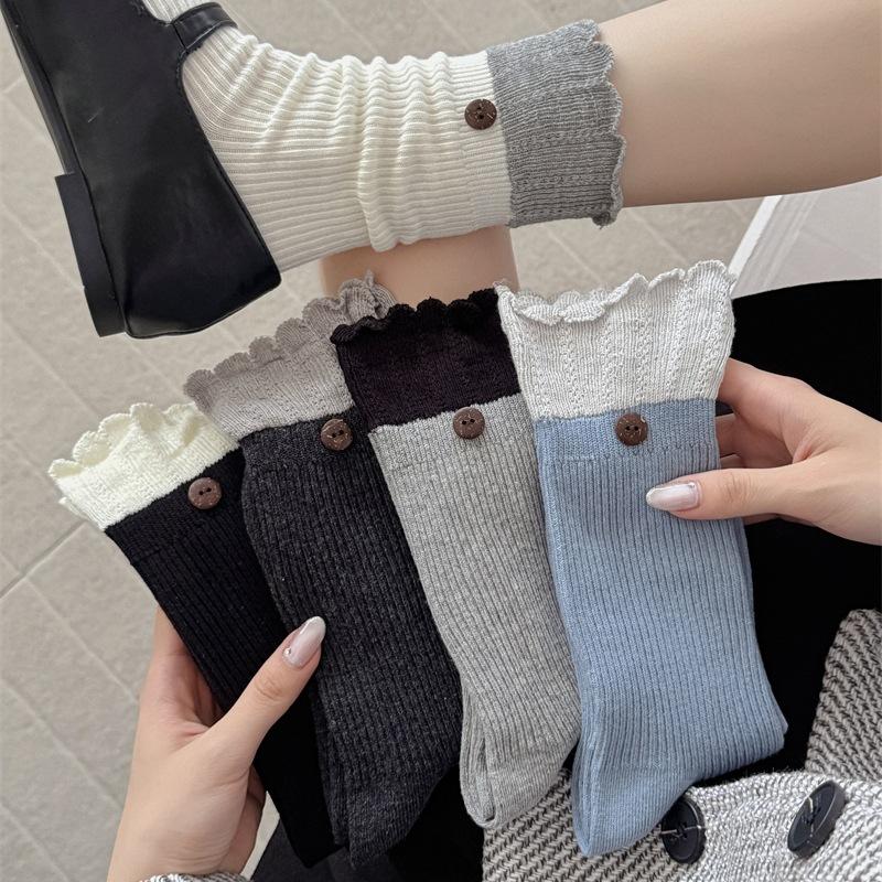 Ladies Autumn Winter Flanging Button Lace Mid Tube Stack Socks