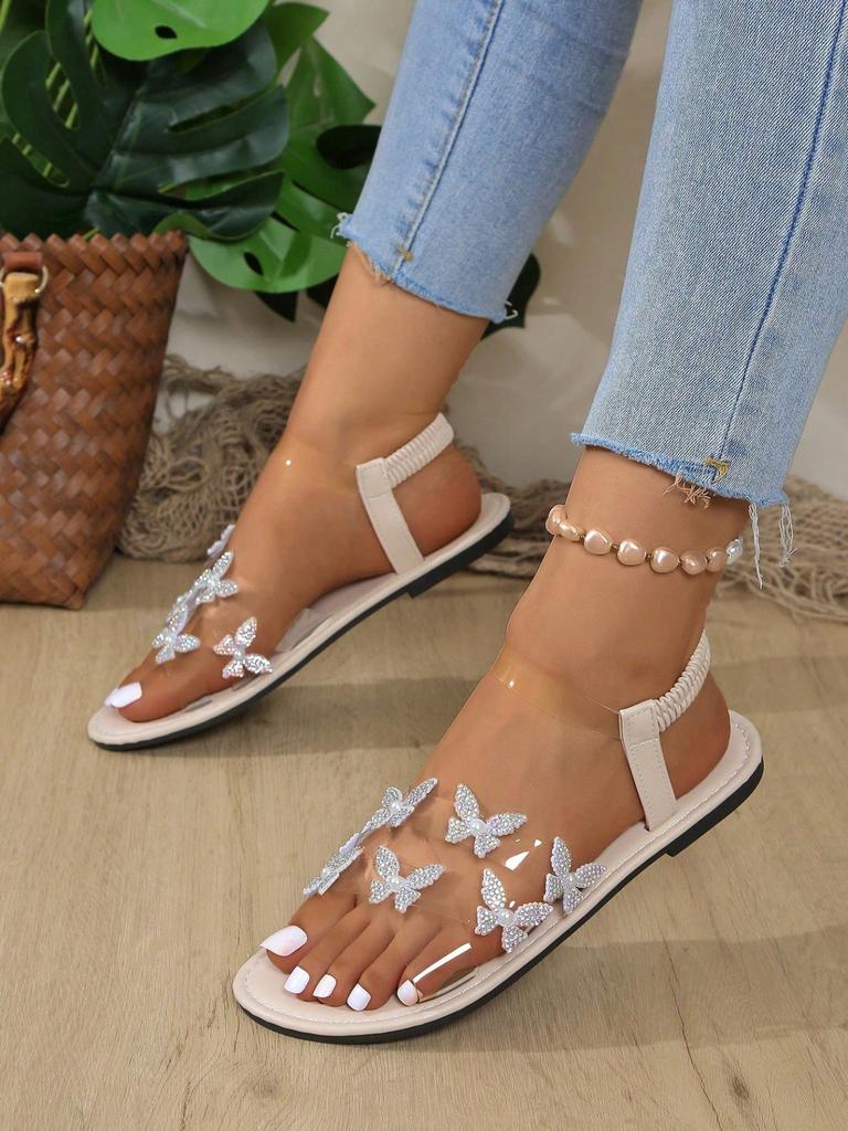 Summer women's round head flat-soled sandals transparent strap rhinestone butterfly flower ankle strap sandals versatile and fresh