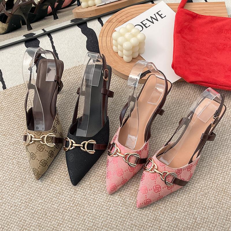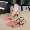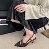 Sandale cu toc înalt și lanț metalic ascuțit pentru comerțul exterior, noi pentru vara 2025, toc subțire, imprimeu, sandale cu cap de geantă europene și americane, pentru femei