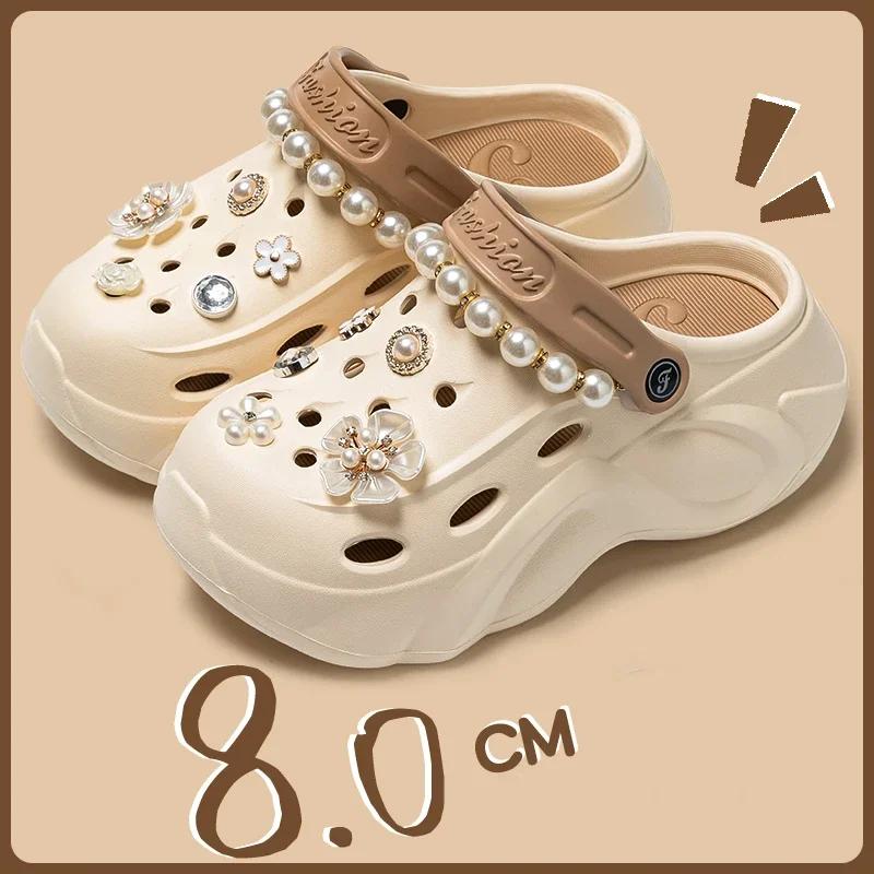 Pearl Chains Diy Clogs for Women Summer 2025 Chunky Platform Soft Bottom Eva Sandals Woman Floral Decor Cloud Slippers Shoes