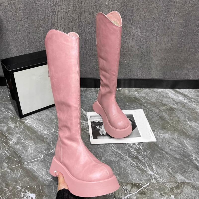 Cizme Sexy din Piele Naturală pentru Femei 2024 Toamnă Nouă Modă Talpă Groasă Rotunde Elegante Cizme de Cavaler Culoare Solidă Casual cu Fermoar